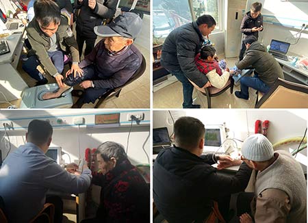 這次活動(dòng),志愿者不但帶來了水果,而且?guī)砹丝七M(jìn)-澳思泰公司自主研發(fā)的超聲骨密度儀,為老人們測量骨密度。